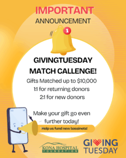 Your support helps make quality healthcare possible right here at Kona Community Hospital. Every gift you give to the Kona Hospital Foundation helps fund equipment, programs, and projects that strengthen the hospital and the care it provides. Your generosity ensures that our doctors, nurses, and staff have the tools they need to care for patients today and for generations to come.